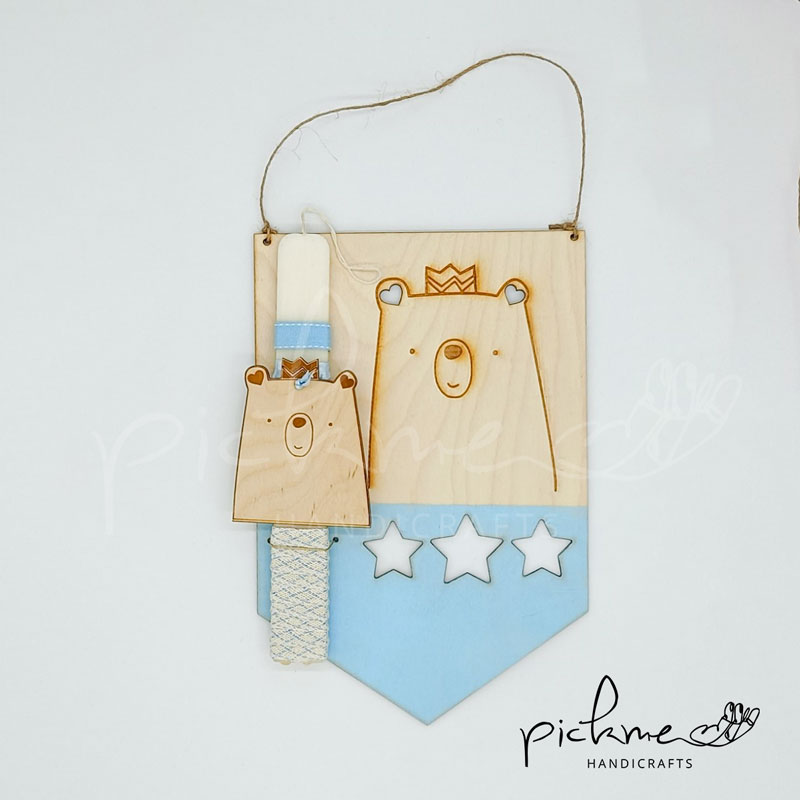 Χειροποίητη πασχαλινή λαμπάδα με πλακέ εκρού κερί, διακοσμητικό ξύλινο με σχέδιο αρκουδάκι, διακοσμητικές κορδέλες.